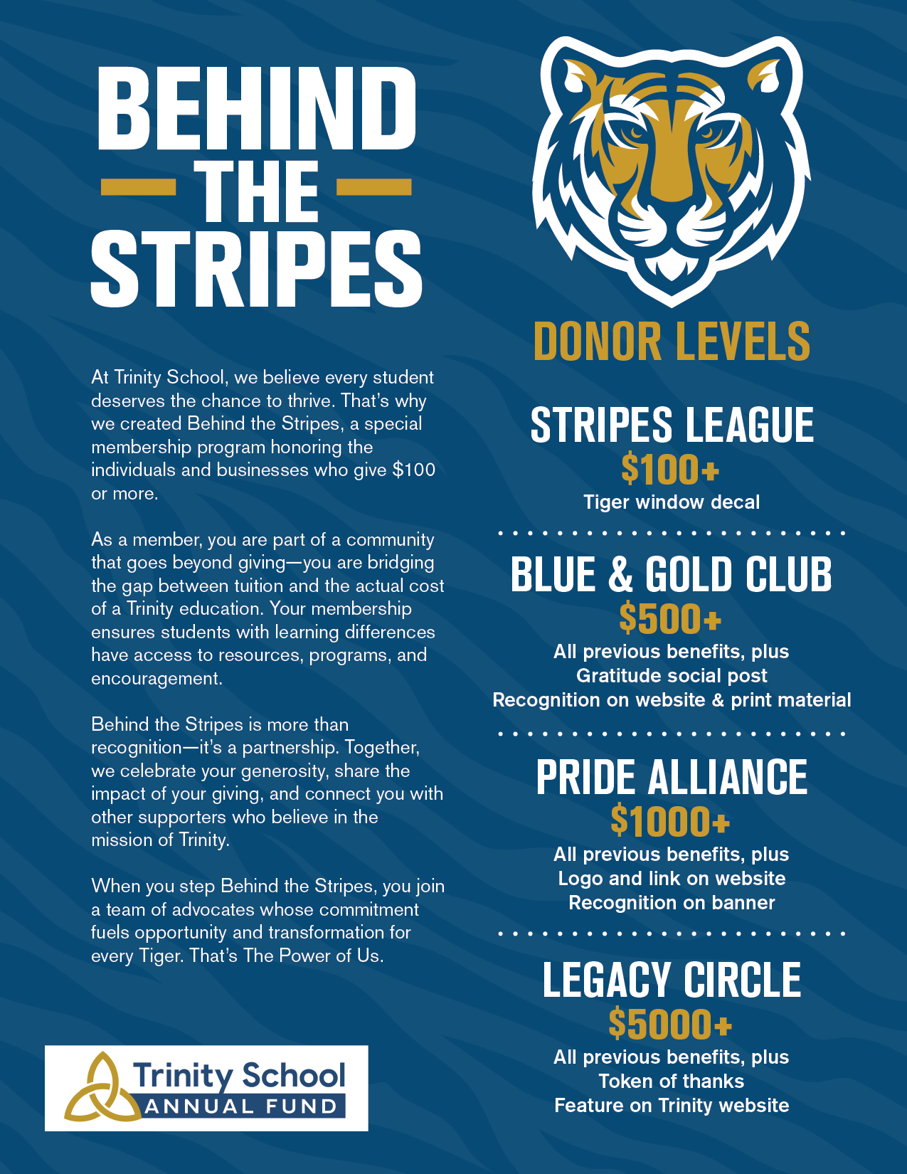 At Trinity School, Behind the Stripes donors are the ones behind the scenes, making everything we do possible. They are families, friends, and community partners who go above and beyond to support our mission—bridging the gap between tuition and the actual cost of a Trinity education.