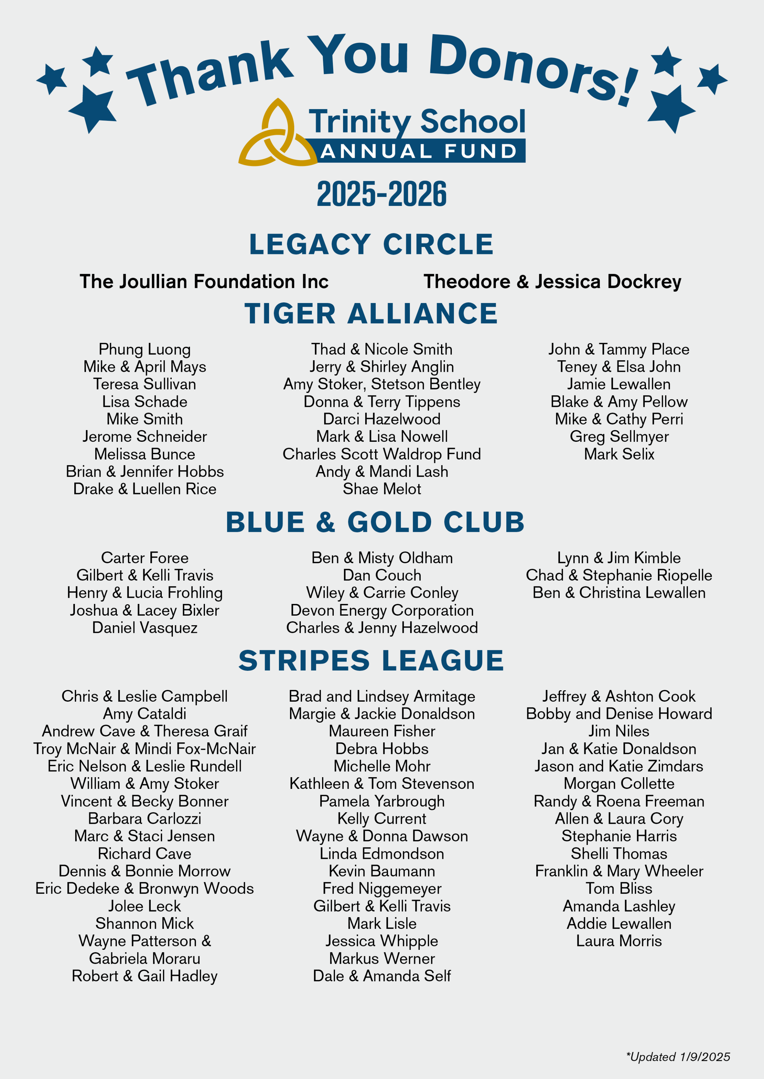 We are incredibly grateful to the generous donors who have supported the 2025-2026 Annual Fund. Every gift—large or small—helps Trinity School continue to provide a transformative education for students who learn differently. Your commitment fuels classroom innovation, campus improvements, and enrichment opportunities that make a lasting impact on our students' lives. Thank you for believing in our mission and investing in our Tigers.